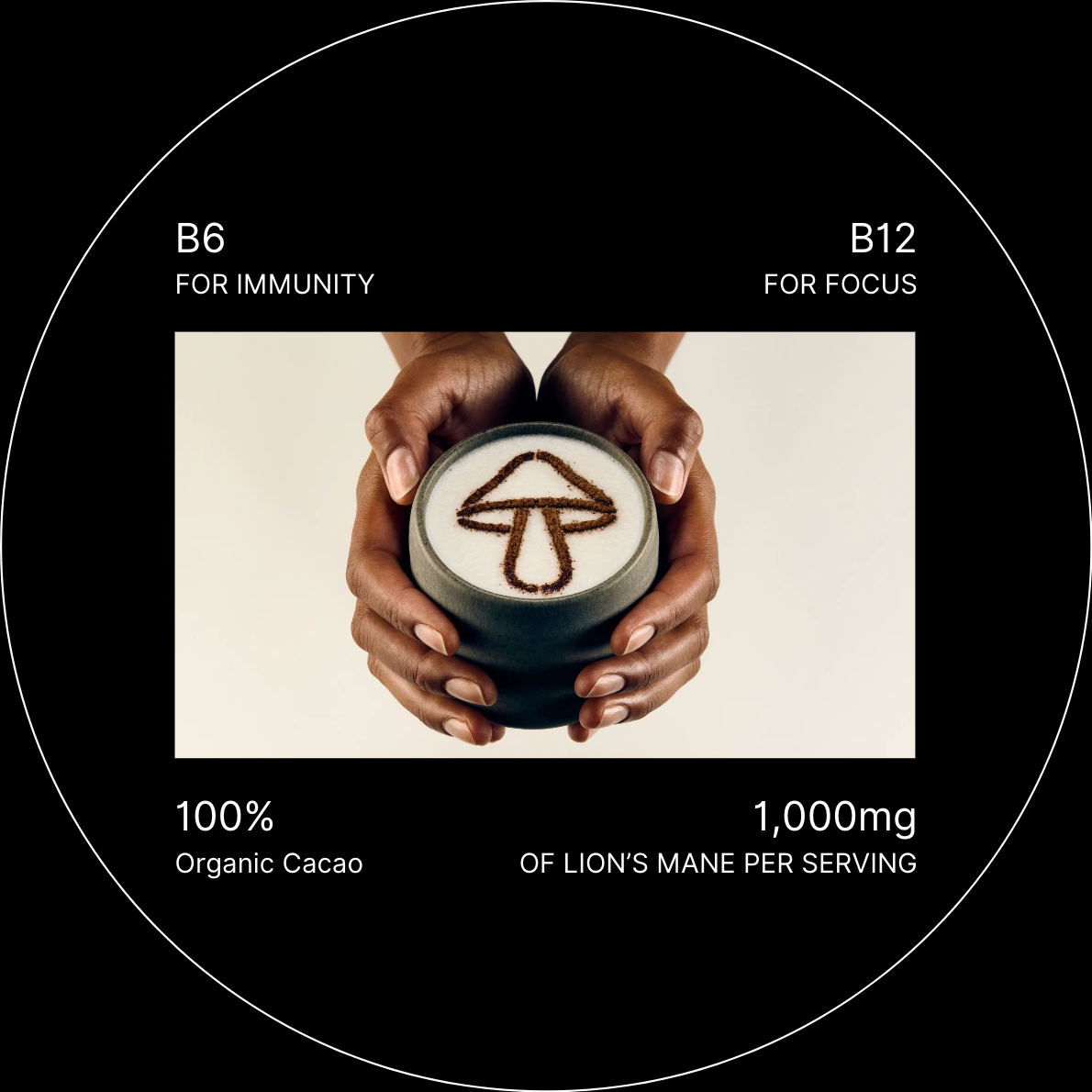 A healthy hot chocolate with Lion’s Mane, Reishi, Tremella, and B vitamins.
