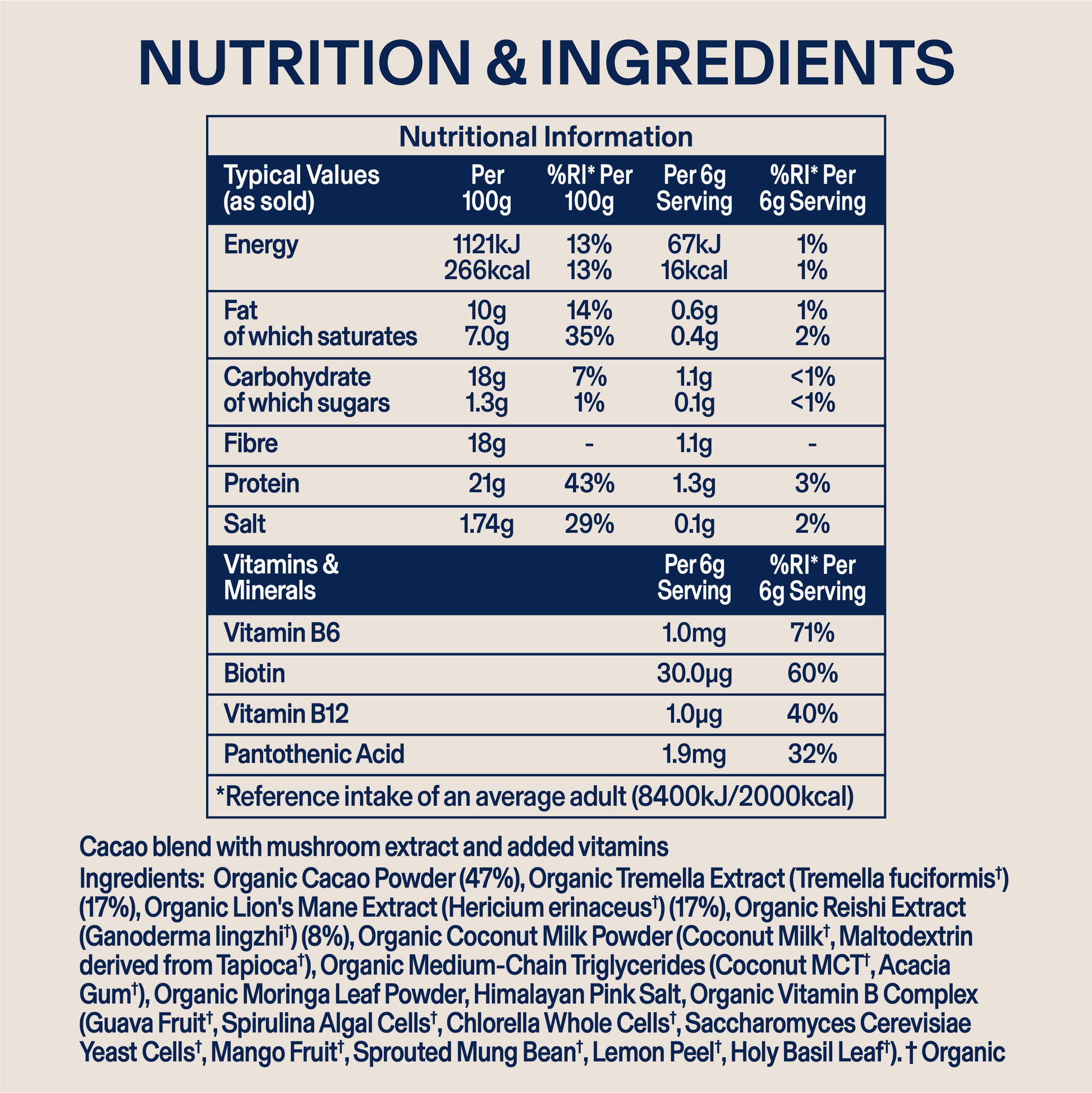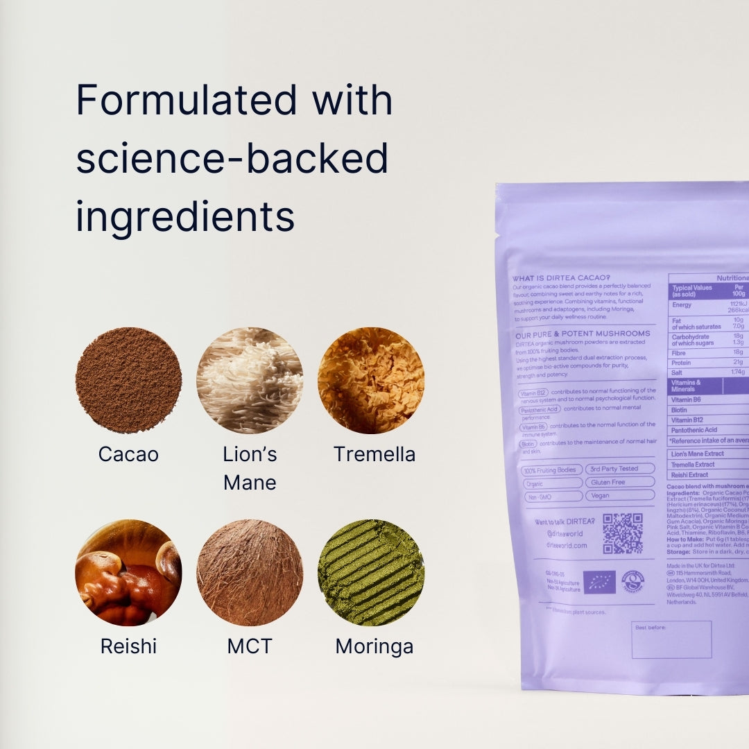 Our customers love DIRTEA Cacao for its rich, chocolatey taste and calming, focus-enhancing properties. Despite its delicious flavour, it's healthy and clean and comes with the additional benefits of Lion's Mane, Tremella and Reishi together with MCT and Moringa.