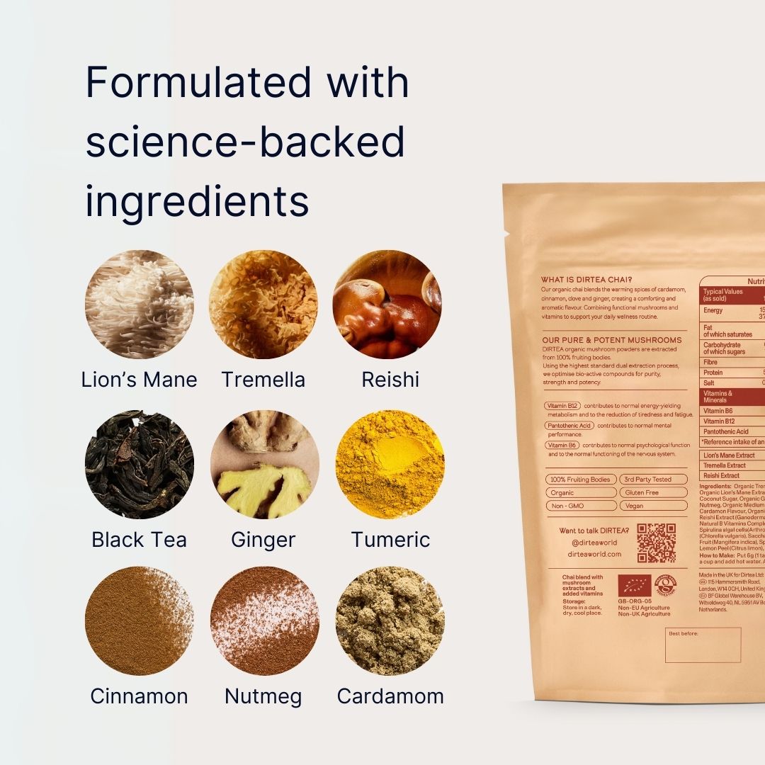 Yes, DIRTEA Chai Powder is infused with a powerful combination of functional mushrooms. It includes organic Lion's Mane extract, known for supporting cognitive function, organic Tremella extract for hydration and skin health, and organic Reishi extract, recognised for its adaptogenic properties to help manage stress. These mushrooms are expertly blended with traditional chai spices to offer both flavour and wellness benefits in every cup.