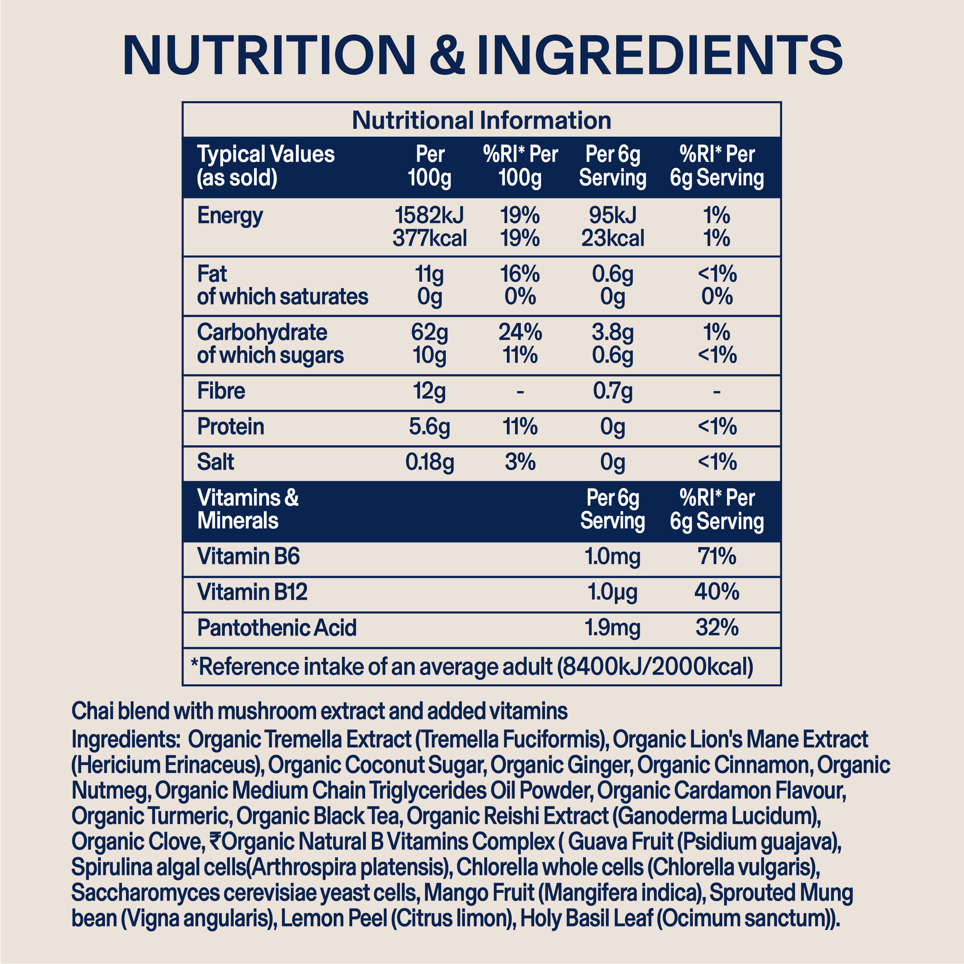 Warm and spicy, with Lion's Mane, Tremella and Reishi, DIRTEA Chai supports immune health and relaxation, making it an ideal choice for winding down or savouring a cozy moment. -
